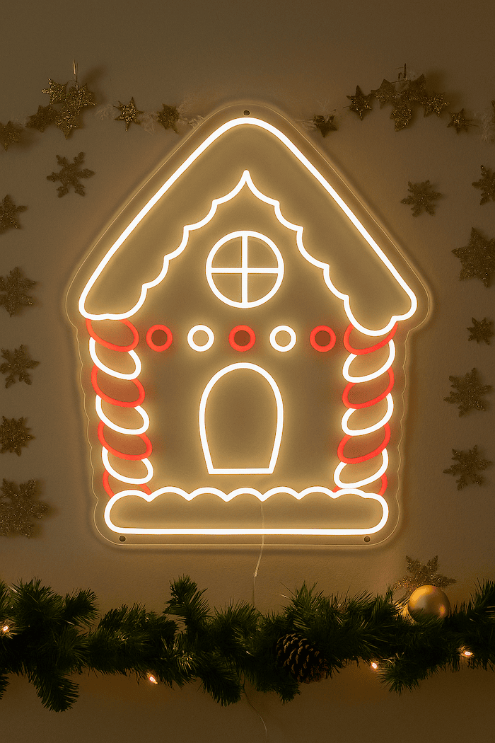 Add a cozy holiday touch with our Gingerbread House Christmas neon sign. This festive light showcases a cheerful red and white gingerbread house, creating a nostalgic atmosphere for your family and guests. Perfect for home decor, Christmas parties, or carol nights, this neon light spreads the joy of the season.